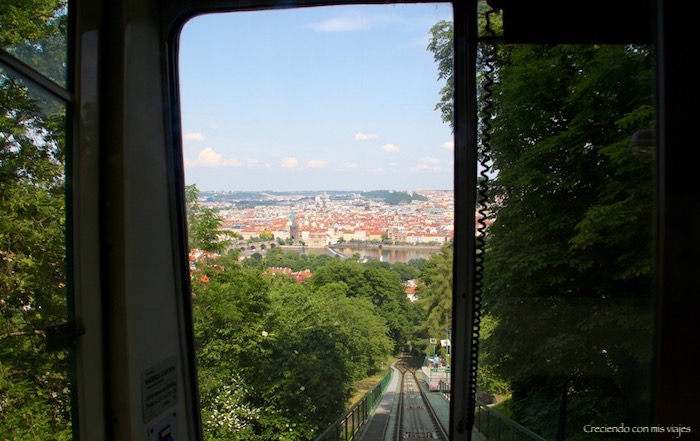 Con las pilas recargadas, cogemos el tranvía nº5 hasta Malostranke Namesti, y allí el 20 hasta Újezd, dónde hacemos transbordo al Funicular de Petřín (incluido en la Prague Card). Hace una parada intermedia en la que hay varios restaurantes, pero nosotros seguimos hasta lo más alto del Monte Petřín, a 138 metros sobre la ciudad de Praga.