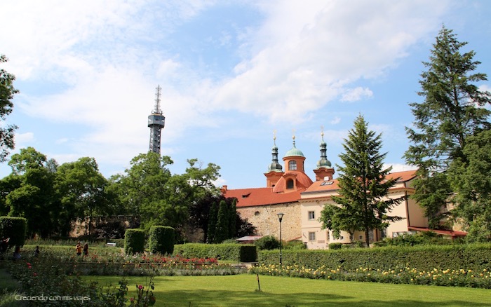Una vez abajo queríamos entrar al Laberinto de los Espejos, otro resquicio de la Exposición de Praga de 1891 pero hay una cola tremenda y pasamos de largo. Nos compramos unos helados (85 CZK los dos) y nos los tomamos sentados en un banco a la sombra en el parque. Se está bien a gusto aquí arriba, vemos a varias familias con sus peques y a jóvenes echando la tarde. El Monte cuenta con un parque inmenso y está muy bien cuidado.