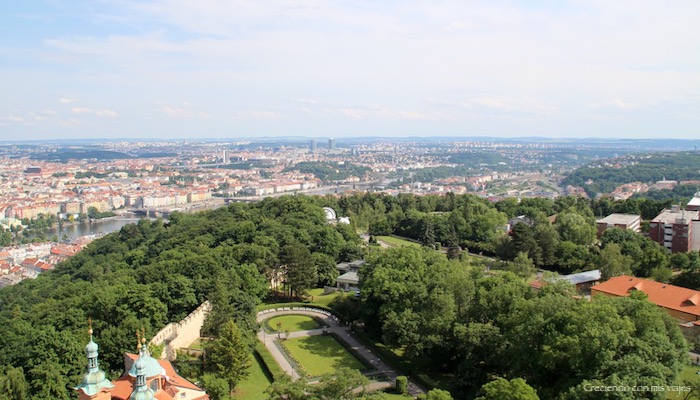 La bajada la hacemos por las escaleras, lo que nos permite seguir disfrutando de las vistas tan bonitas de la ciudad, así como de los jardines de Petřín.