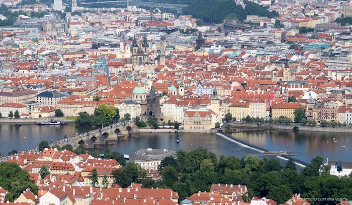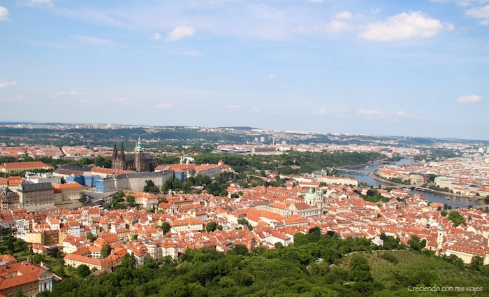 Desde arriba tenemos unas vistas fabulosas sobre la ciudad, a 200 metros de altura sobre el río Moldava. Pasamos un buen rato aquí arriba contemplándolas. Esta ciudad tiene una vista panorámica realmente chula, y de nuevo, podemos ver el siempre abarrotado Puente de Carlos y el Castillo con la Catedral de San Vito que visitamos ayer.