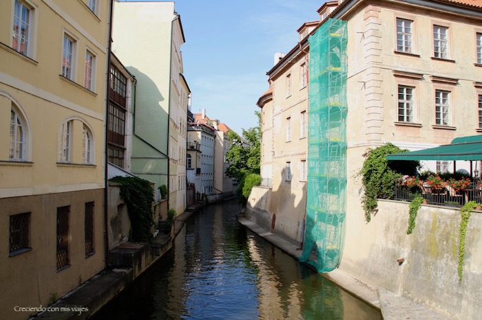 Situada entre el río Moldava y el riachuelo Čertovka, un brazo del Moldava cuya traducción podría ser «río del Diablo». La leyenda dice que el nombre del río proviene de una malhumorada lavandera que blanqueaba la ropa en este río. Desde aquí, hay unas bonitas vistas del río. Encontramos unos bancos con buenas vistas, nos sentamos un ratito a descansar y disfrutar del lugar.