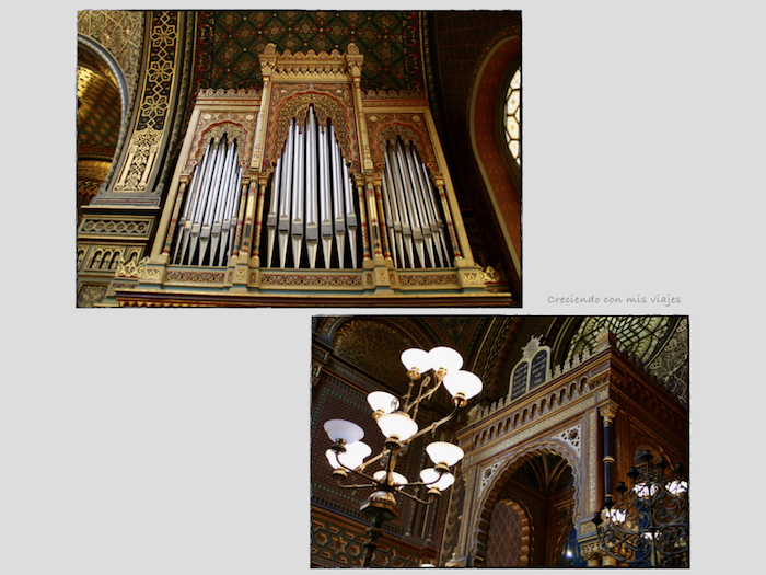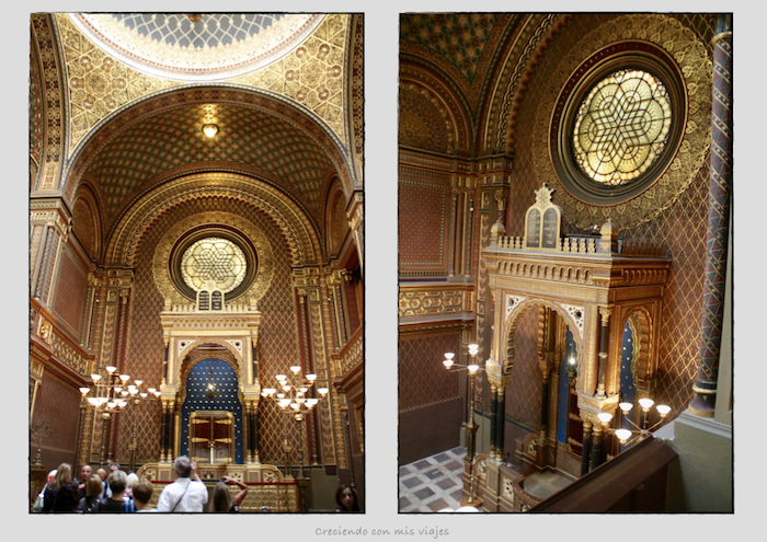 A la entrada al edificio a mi marido le ofrecen una kipá para cubrirse la cabeza. A la salida nos indican que la guardemos para acceder al resto de edificios del Museo Judío. En su interior encontramos textos hebreos y dibujos de niños cautivos en el campo de concentración de Terezín. Aquí podemos observar claramente la separación del edificio por sexos para las ceremonias.