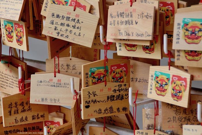 Caminamos unos 12 minutos hasta llegar al santuario Namba Yasaka Jinja, un lugar de lo más peculiar… Este pequeño santuario sintoísta fue duramente dañado por los bombardeos de la Segunda Guerra Mundial y cuando lo reconstruyeron, lo decoraron con algo que lo hace muy particular: un enorme Ema-Den.