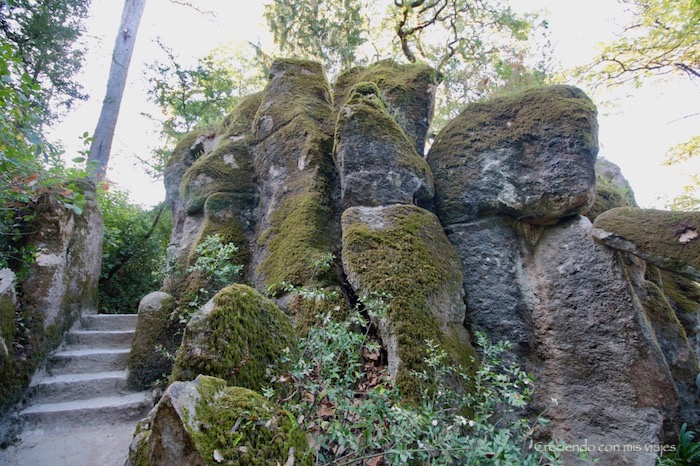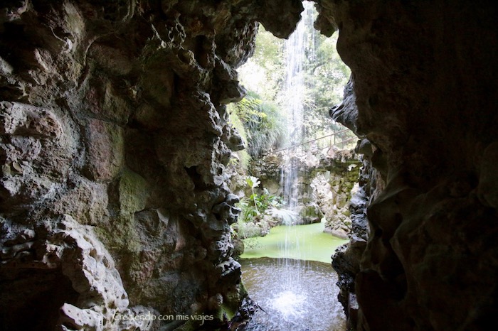 Es un lugar muy bonito, y vemos que muchos cruzan a través de un camino de piedras para salir de nuevo a los jardines. Pero no vemos muy claro caminar por las piedras ya que muchas están mojadas. Algunos se pegan buenos resbalones y el agua está súper estancada… Si nos caemos ahí, cogemos la triquinosis como poco 😛 Así que seguimos avanzando por los túneles cruzando la Gruta de Oriente, la otra entrada al Poço, hasta llegar de nuevo a los jardines. Seguimos recorriéndolos hasta llegar al Palacio da Regaleira.