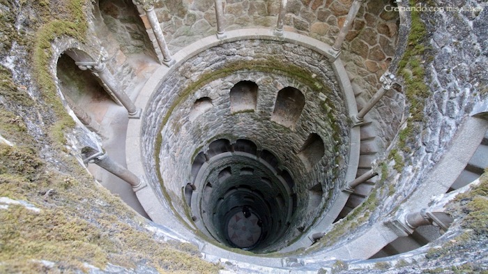 Lo que parece un montón de piedras, es en realidad una de las entradas al Poço. Una «torre invertida» de 27 metros de profundidad hacia el interior de la tierra, con acceso a través de una espectacular escalera de caracol que te lleva hacia abajo.