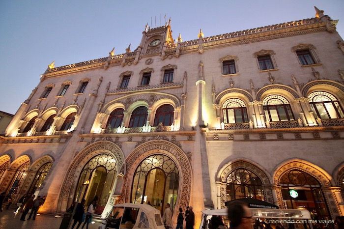 El trayecto dura otros 55 minutos. Llegamos a Lisboa a las 17,30h. Empieza a anochecer y comienzan a iluminar sus calles y edificios emblemáticos, como la fachada de la Estación de Rossio.
